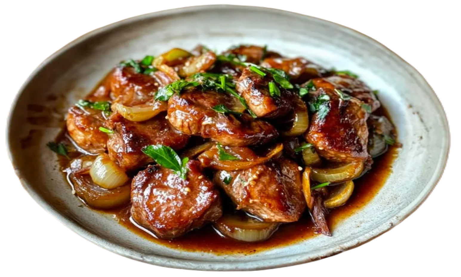 Fricassée de boeuf caramélisée aux oignons sauce soja.