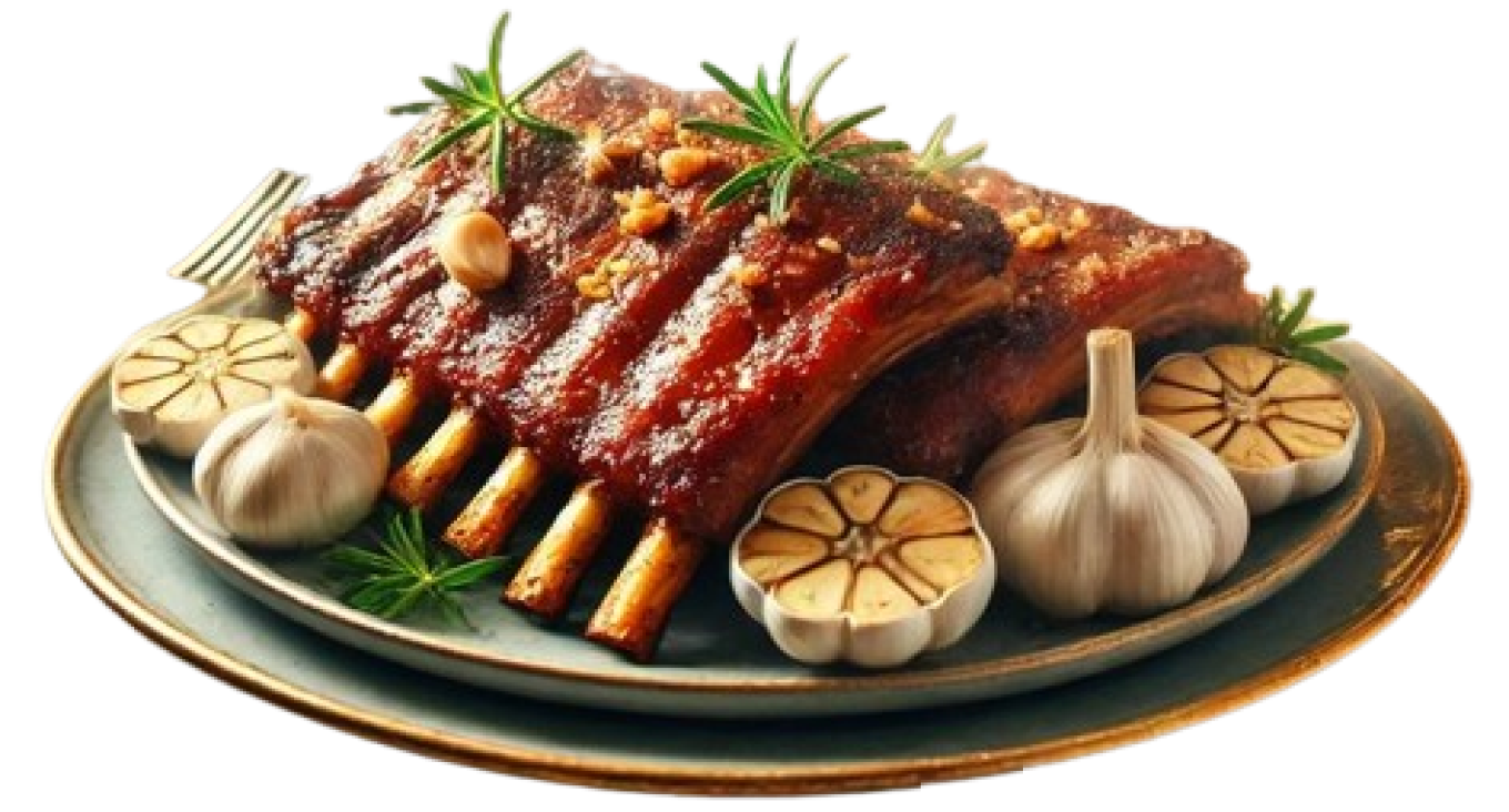 Ribs de porc grillés au charbon de bois à l'ail confit.