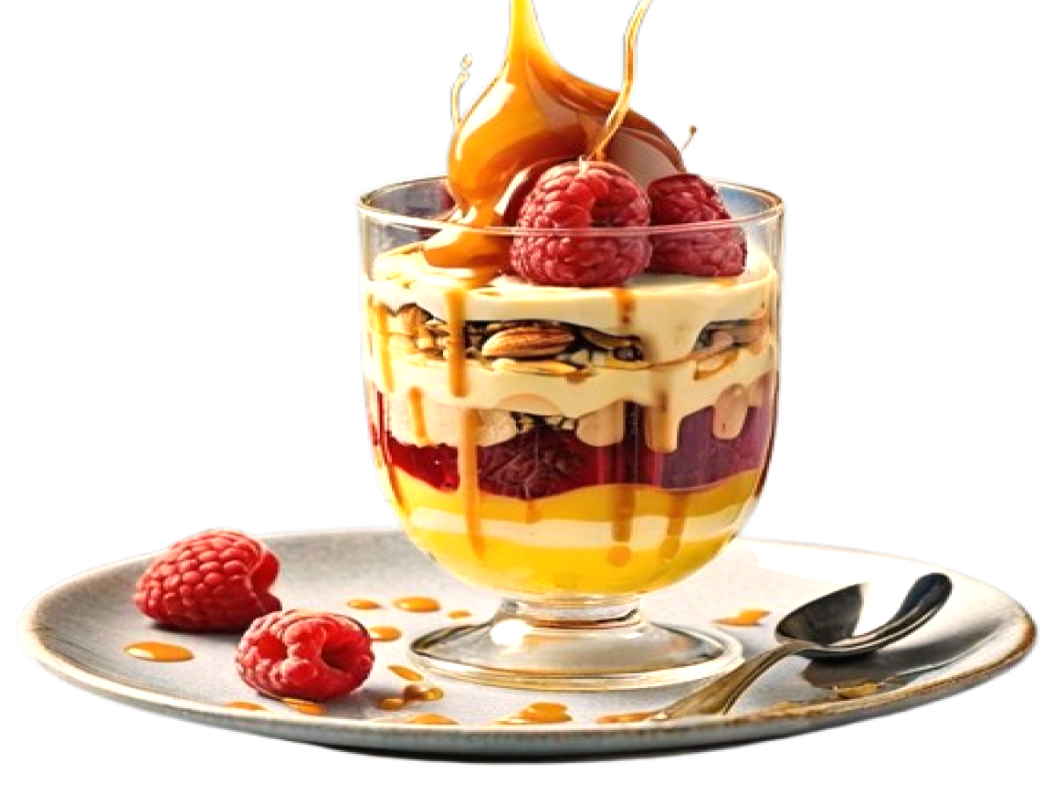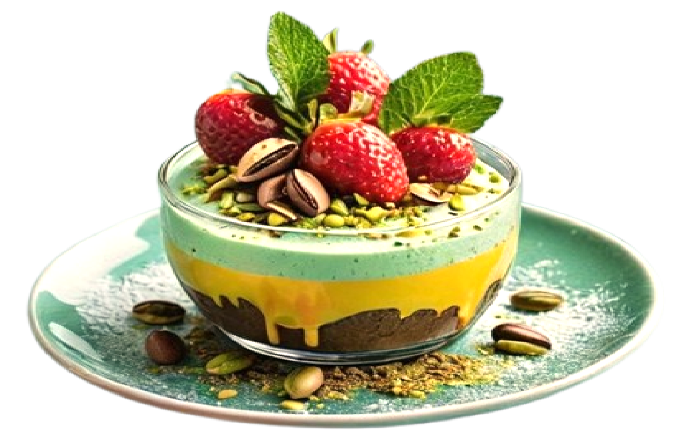 Verrine de mousse de mangue, chocolat, amandes, pistaches.